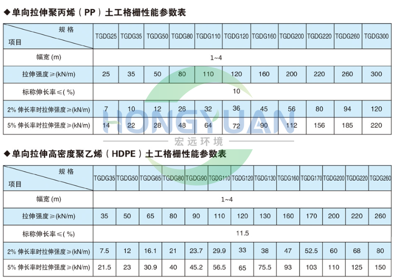 单向塑料土工格栅产品规格:TGDG35、TGDG50、TGDG80、TGDG120、TGDG160、TGDG260、TGDG300等。幅宽1m~3m