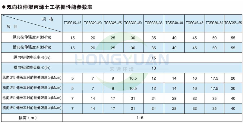 双向塑料土工格栅产品规格:TGSG1515、TGSG2020、TGSG2525、TGSG3030、TGSG3535、TGSG4040、TGSG4545、TGSG5050、TGSG6060等。幅宽2m~6m